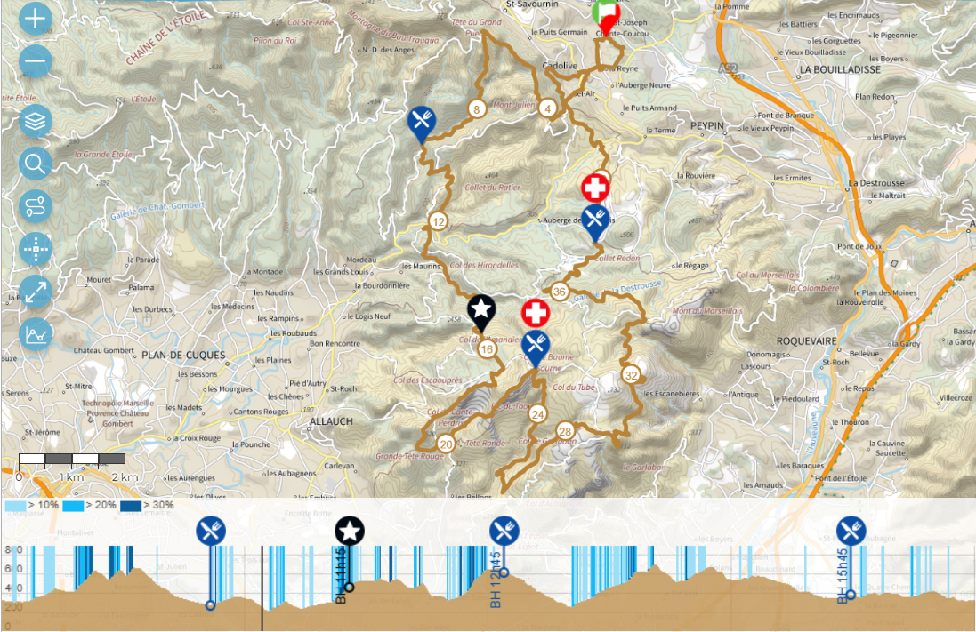 Ça va piquer, on vous aura prévenu… Un ravitaillement vous attend au col de Baume Sourne (23km – 1600d+) afin de reprendre des forces pour s’attaquer à la longue descente puis la remontée par le pas de Garrige qui mène au Garlaban, point culminant de la course.